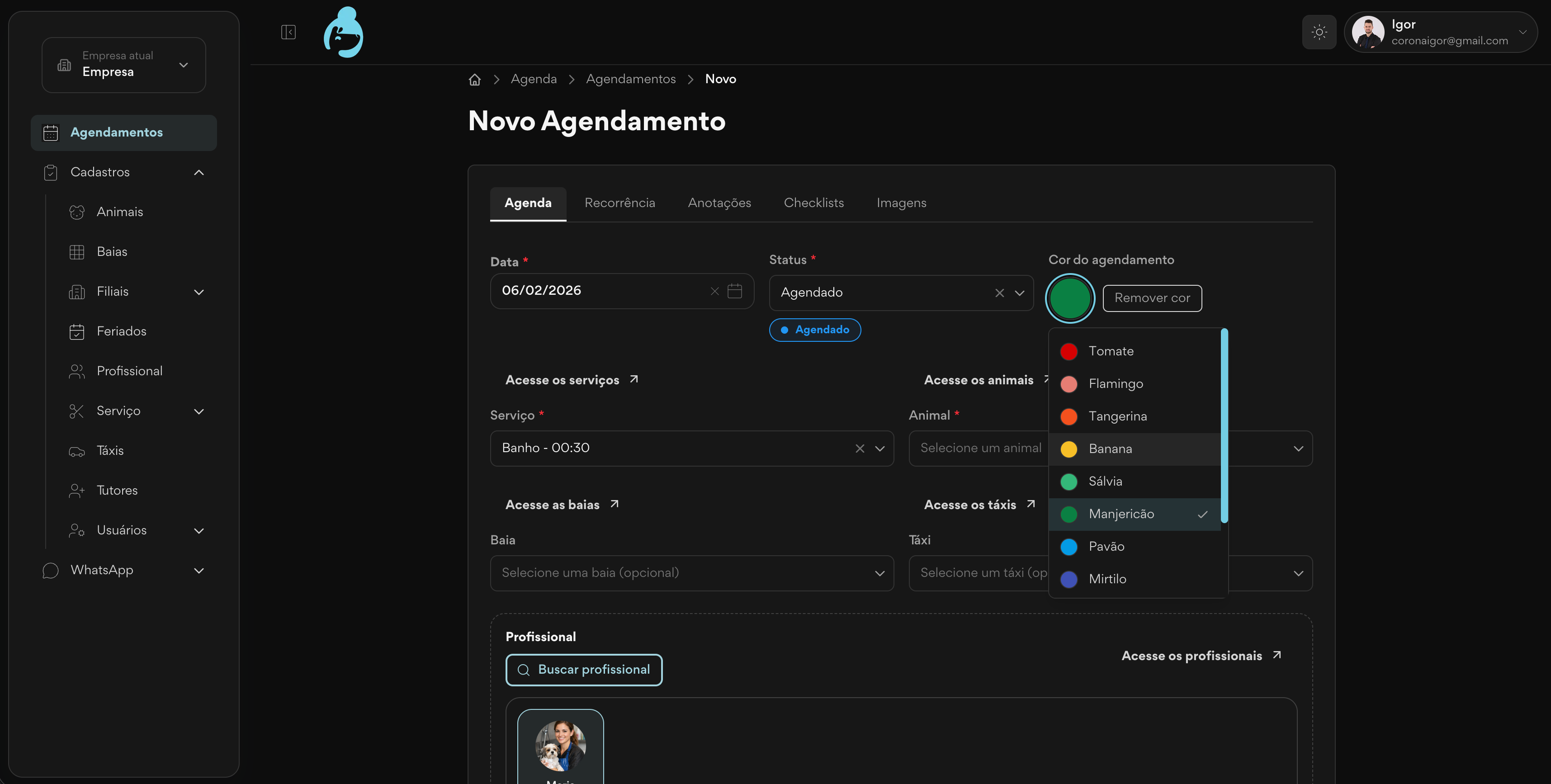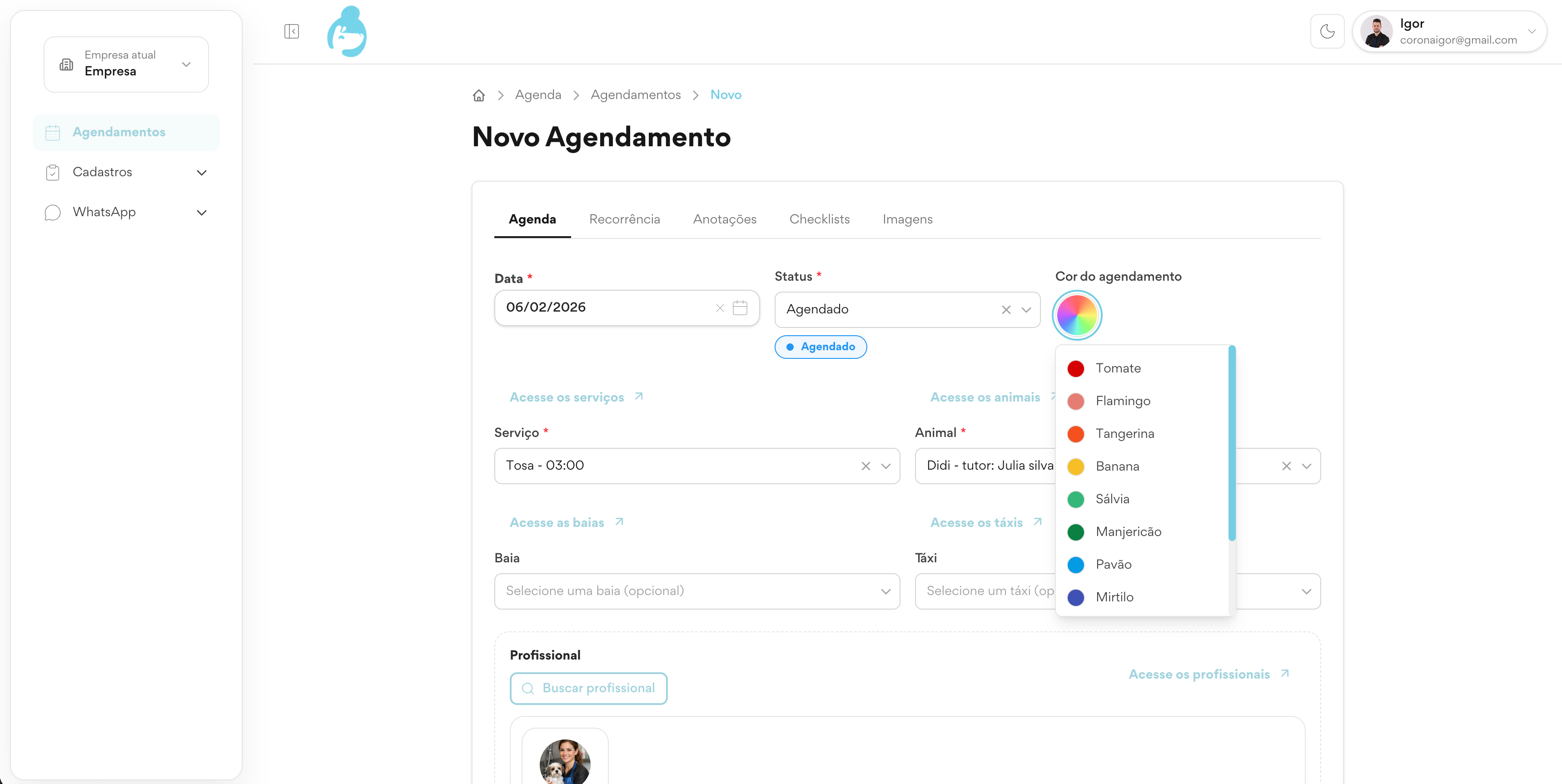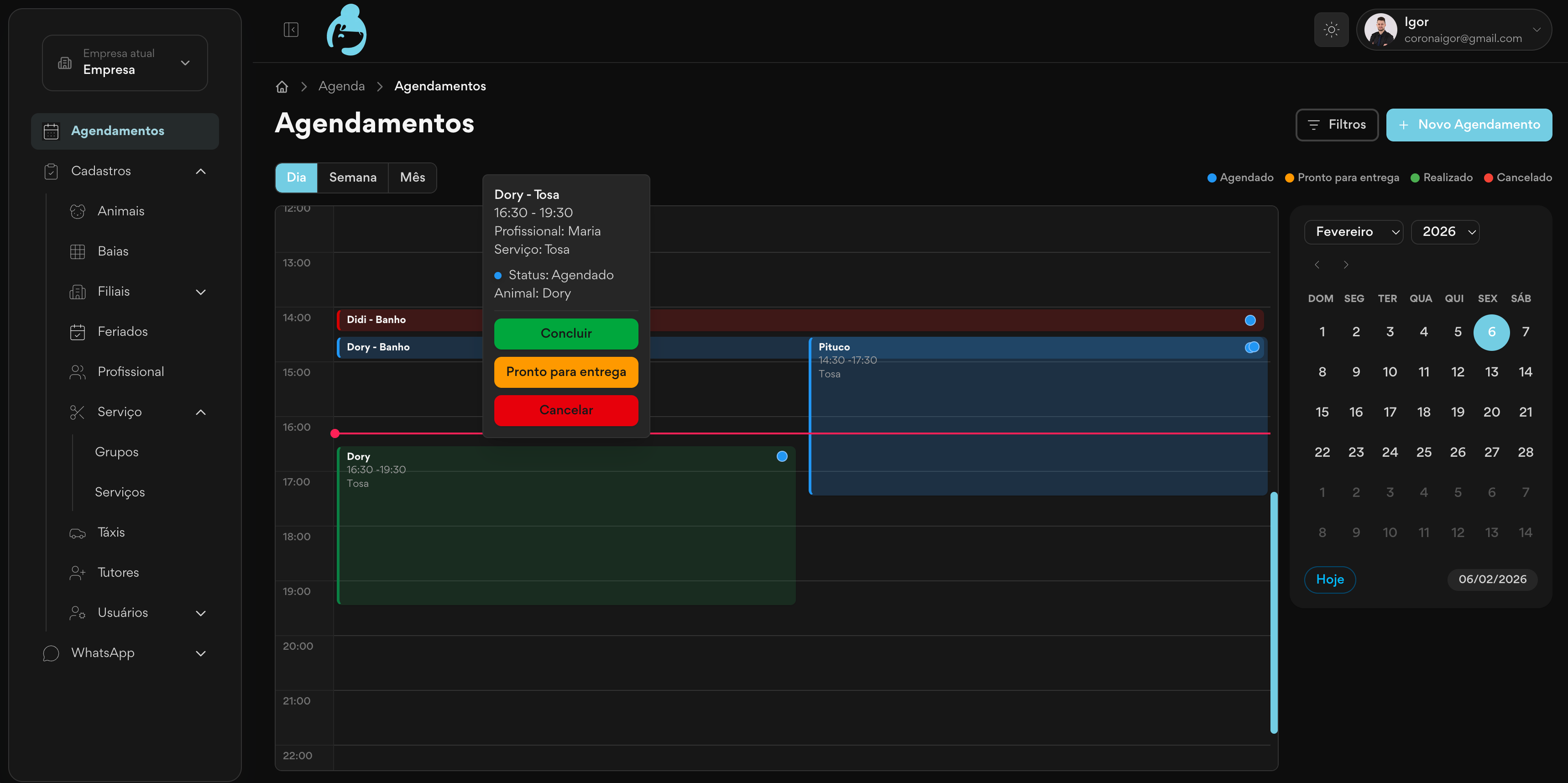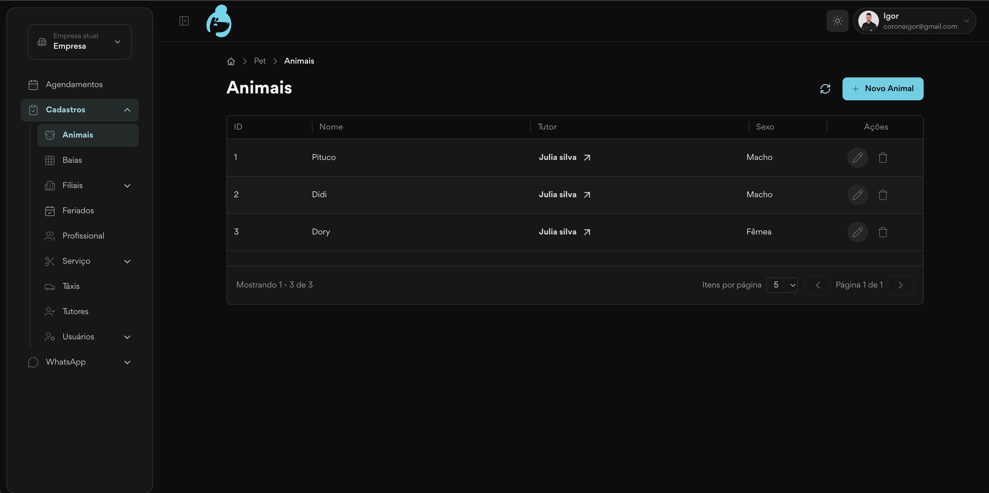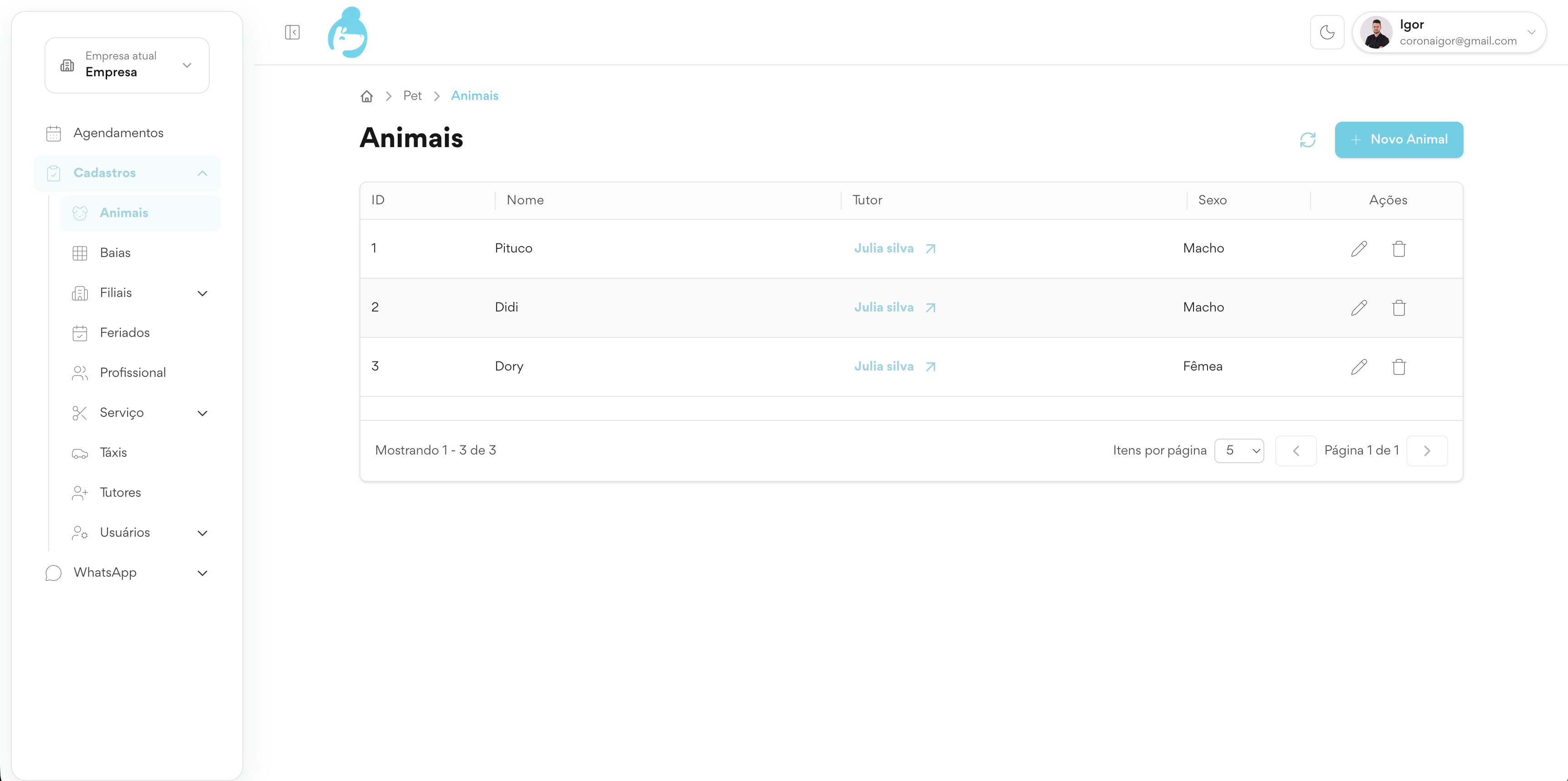 - Operação vinculada por tutor e animal.